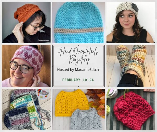 I’m super excited to be part of the Head Over Heels Blog Hop (Feb. 10-24)! This fun 15-day event is all about crochet designs for your head (think hats, ear warmers, and headbands) and feet (socks, slippers, boot cuffs).