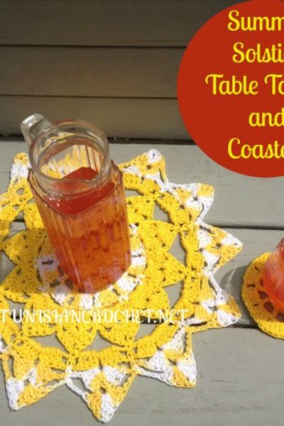 Summer is here! What better way to celebrate than to put out a nice spread on the back deck, complete with a pitcher of something cold and sweet – and what better way to present your sweet tea, Sangria, or fruit punch than with a bright and cheerful crocheted sun motif table topper with matching coasters. >>> SIGN UP FOR…